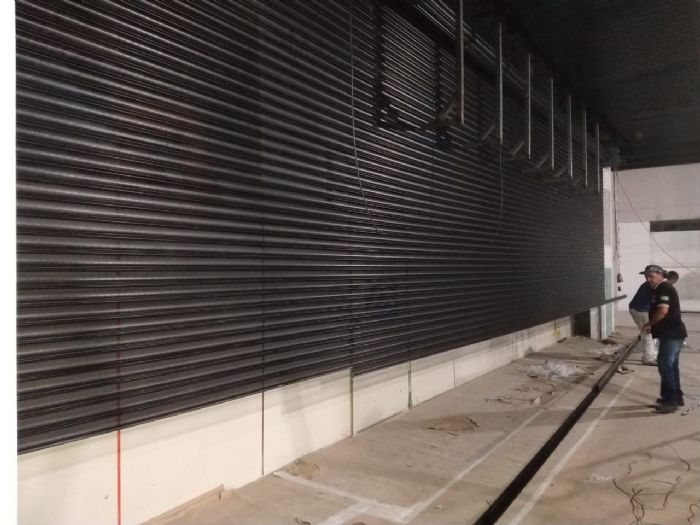 Detalhes: Instalação de Porta Automática 12x5, chapa 22, pitura eletrostática preta, eixo com tubo de 8 polegadas, guia de 60x90, motor de 1.500 kilo trifásico 220.